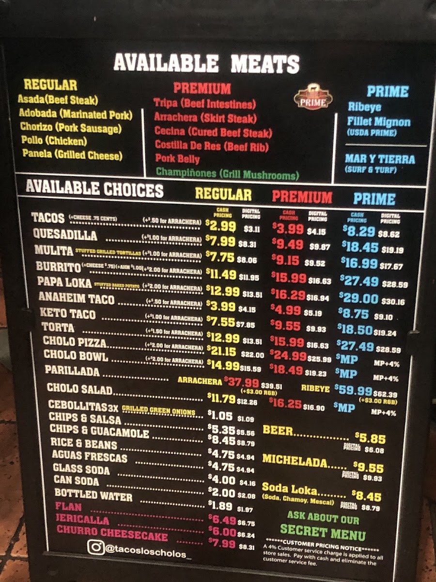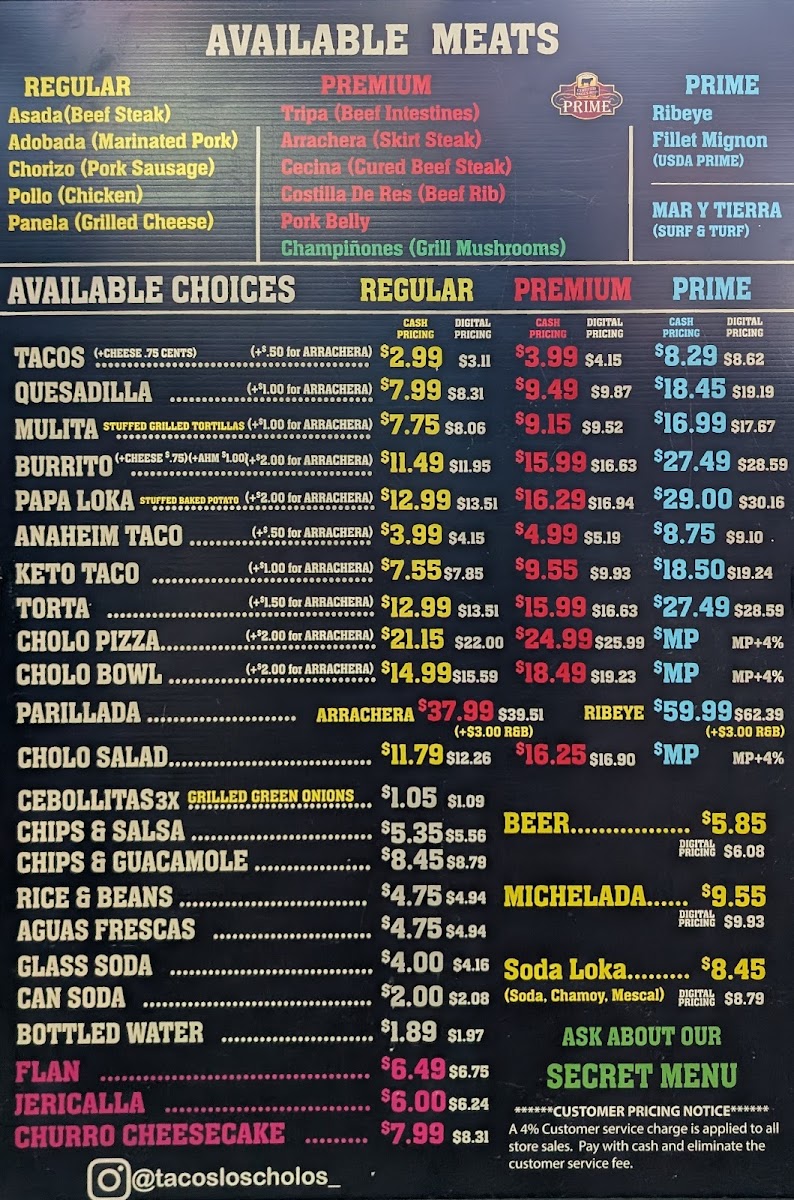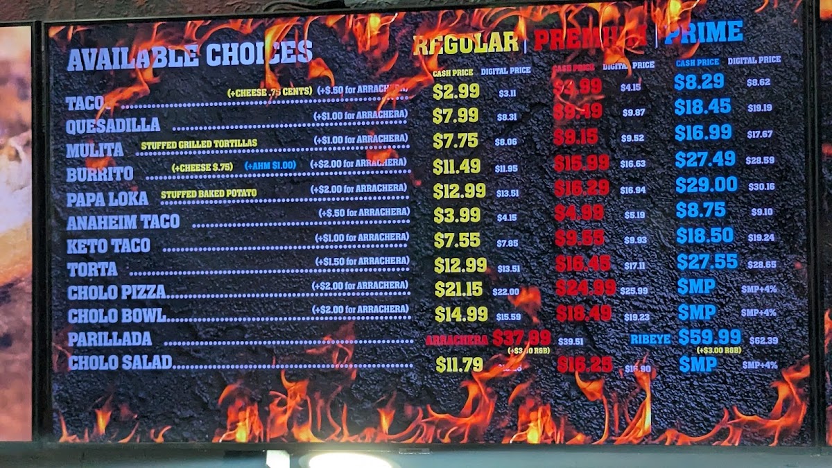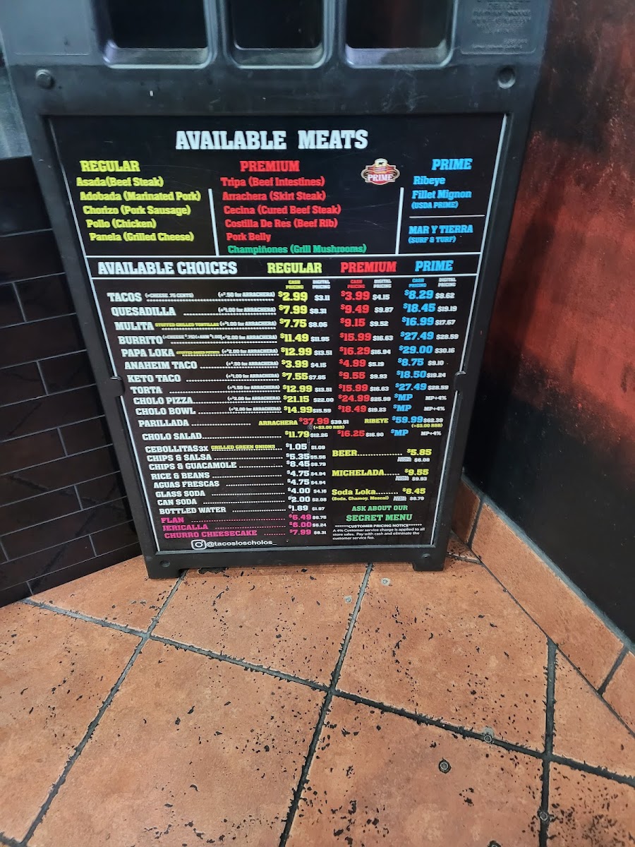 Cholo Bowls & Salads: Bowls include a choice of meat combined with beans, rice, onions, cilantro, and guacamole, with options for additional toppings such as pickled onions and sour cream. These bowls are also available in Regular, Premium, and Prime sizes.