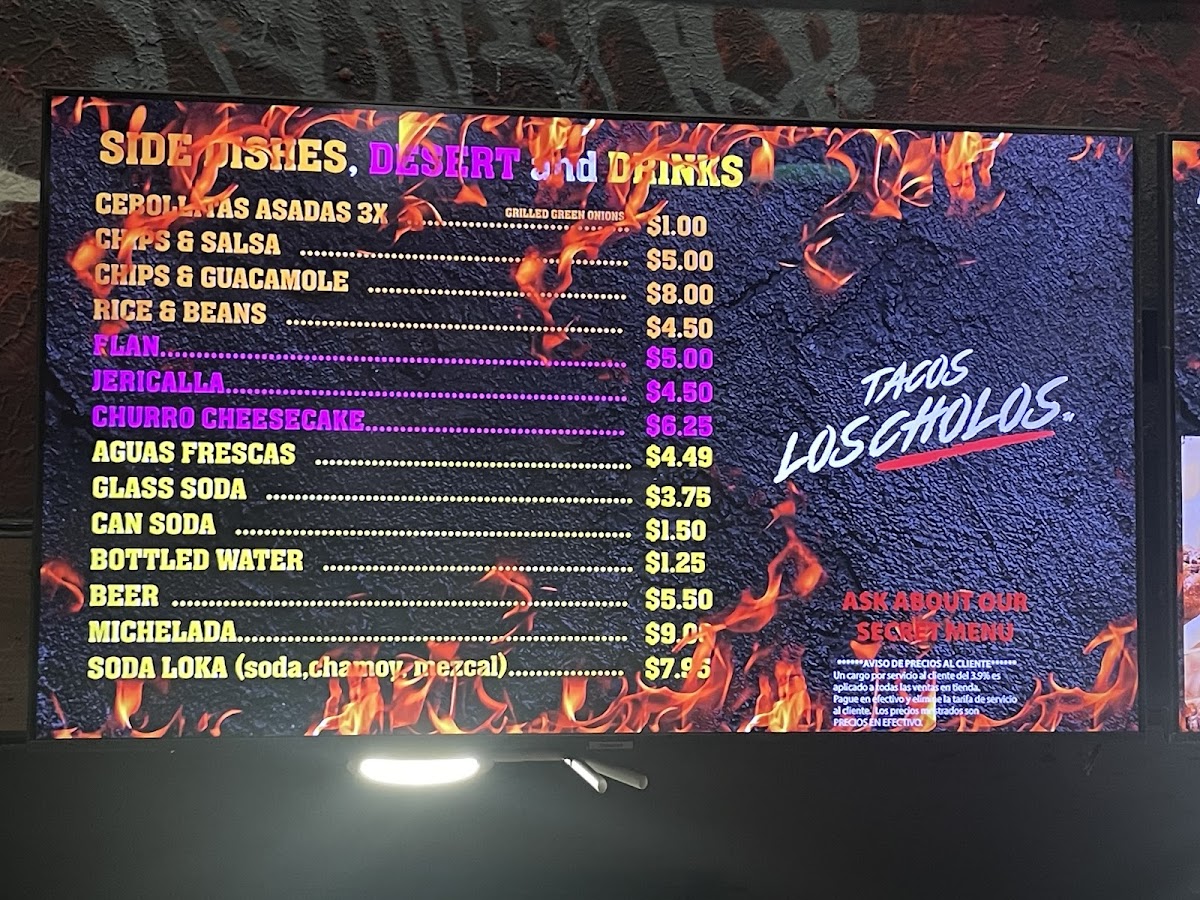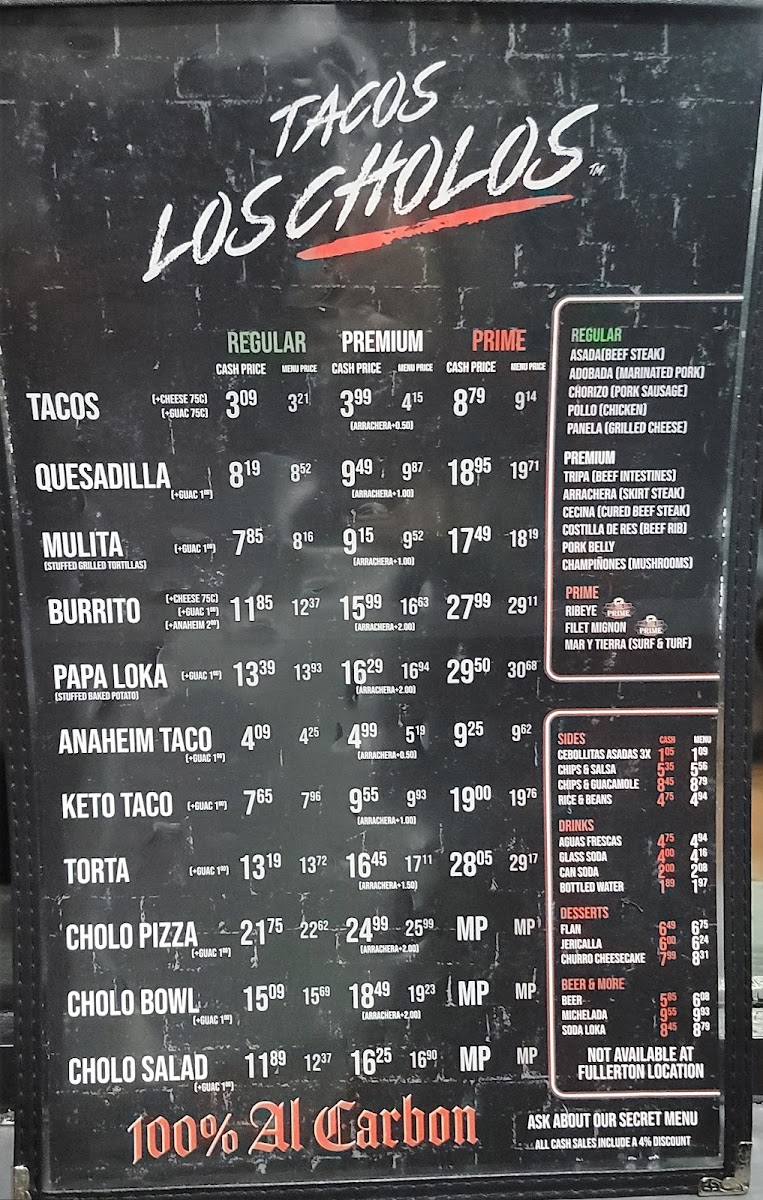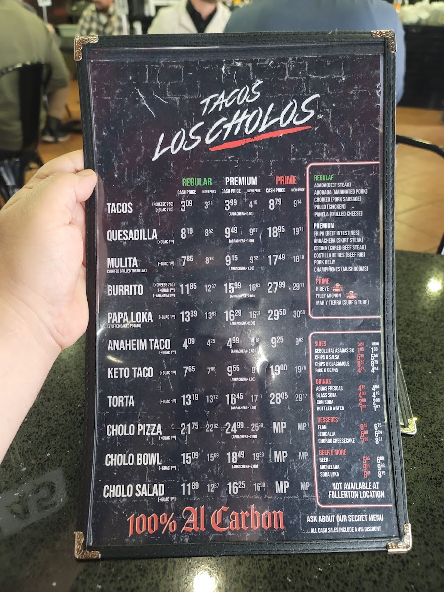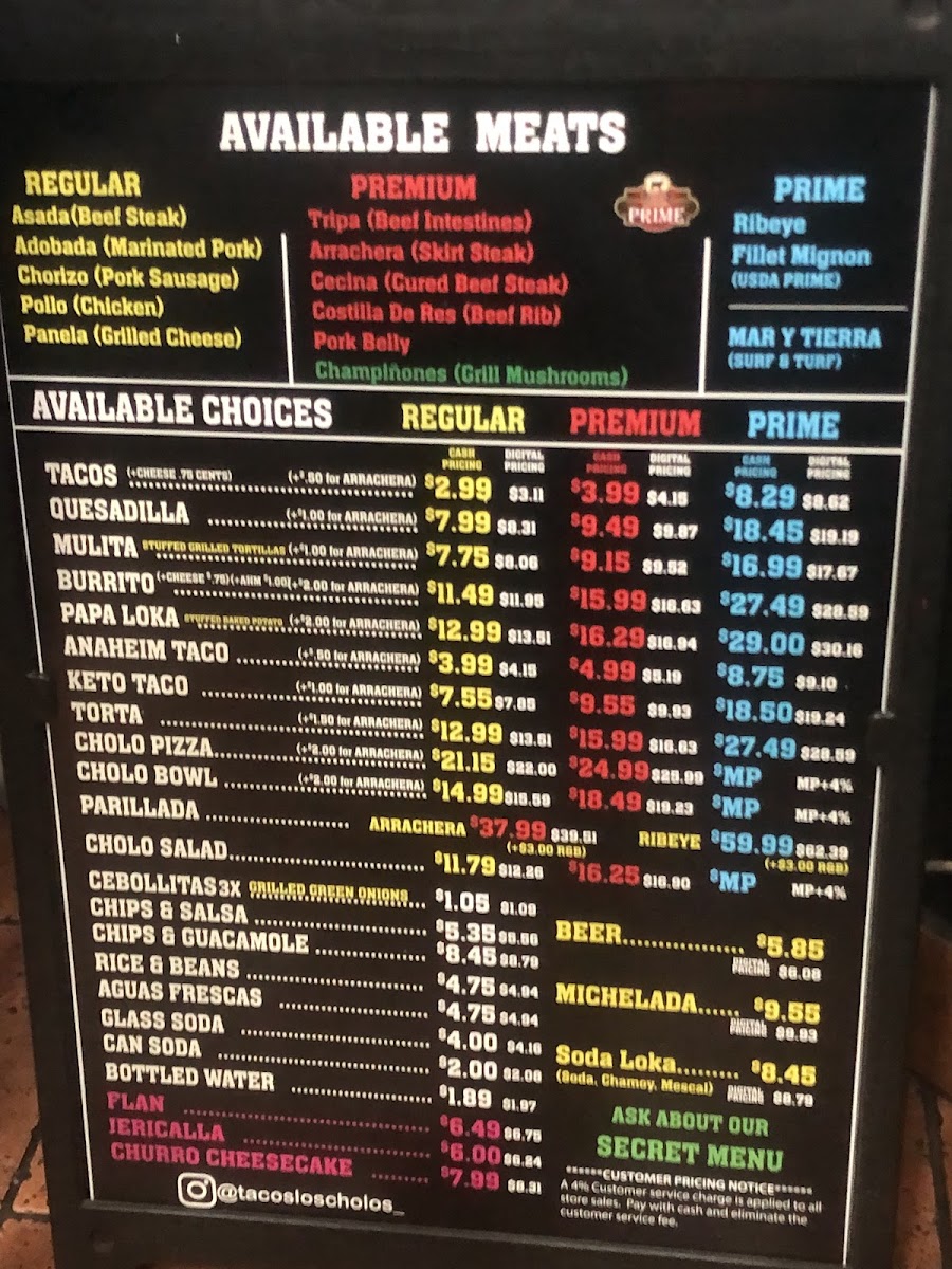 Cholo Bowls & Salads: Bowls include a choice of meat combined with beans, rice, onions, cilantro, and guacamole, with options for additional toppings such as pickled onions and sour cream. These bowls are also available in Regular, Premium, and Prime sizes.
